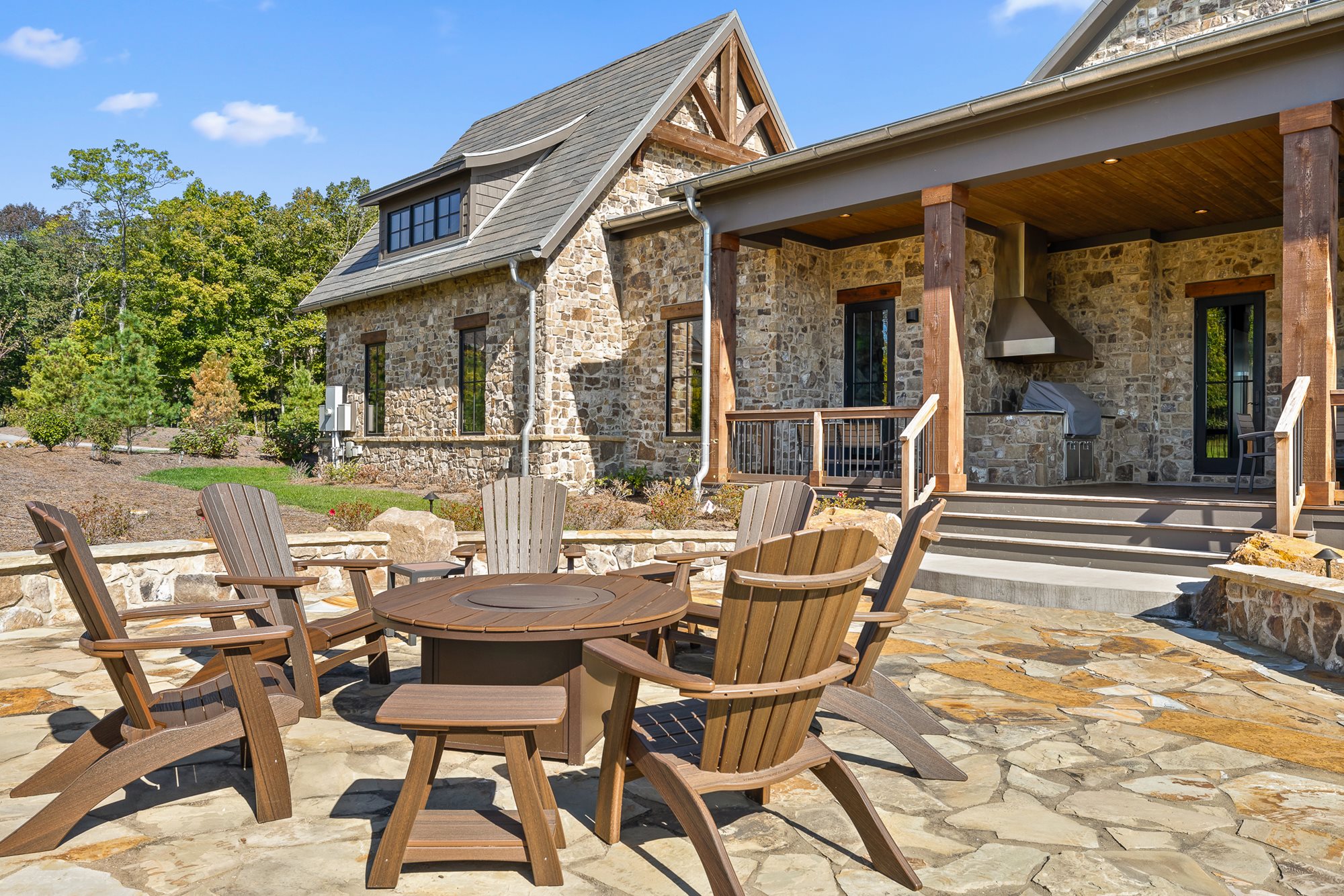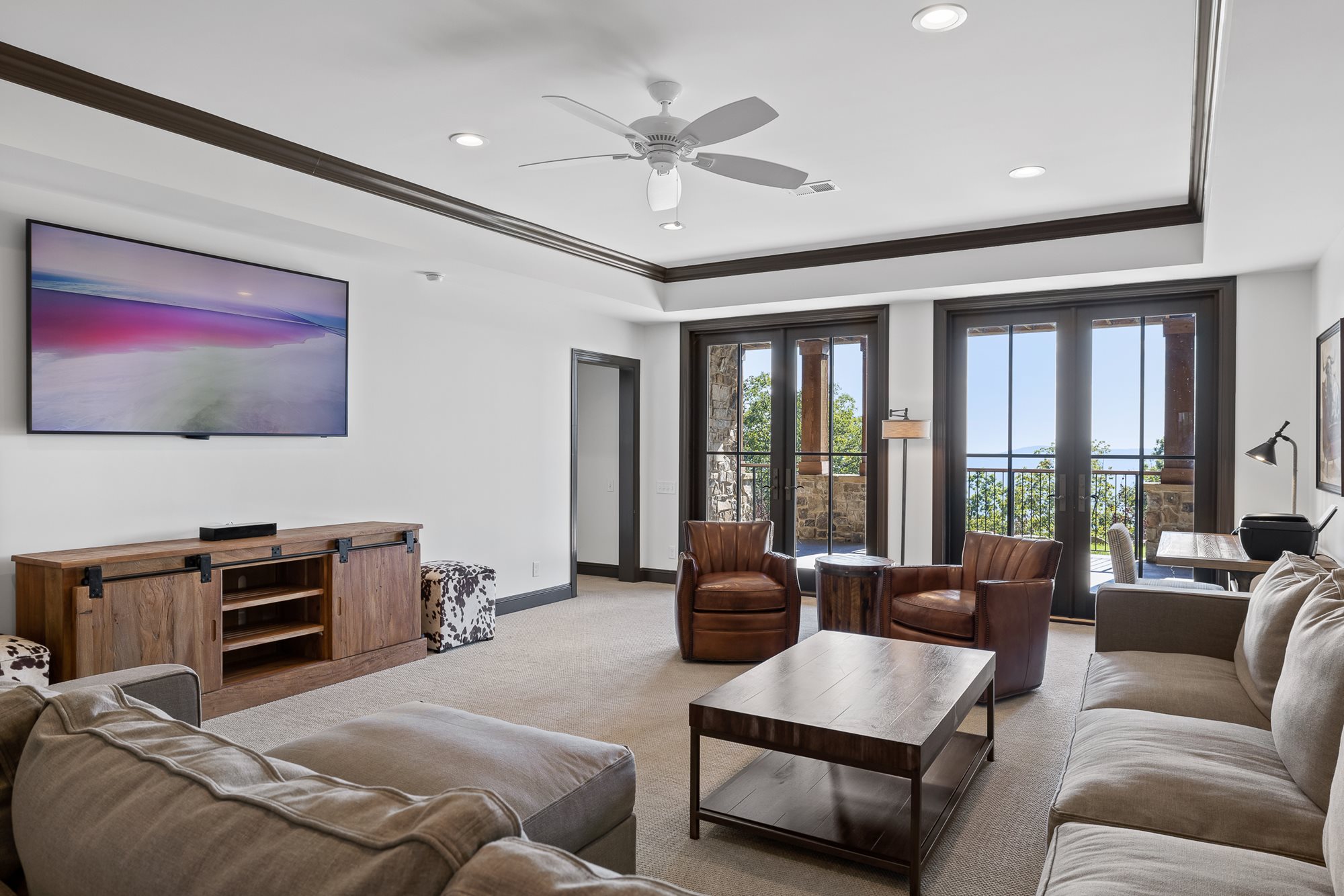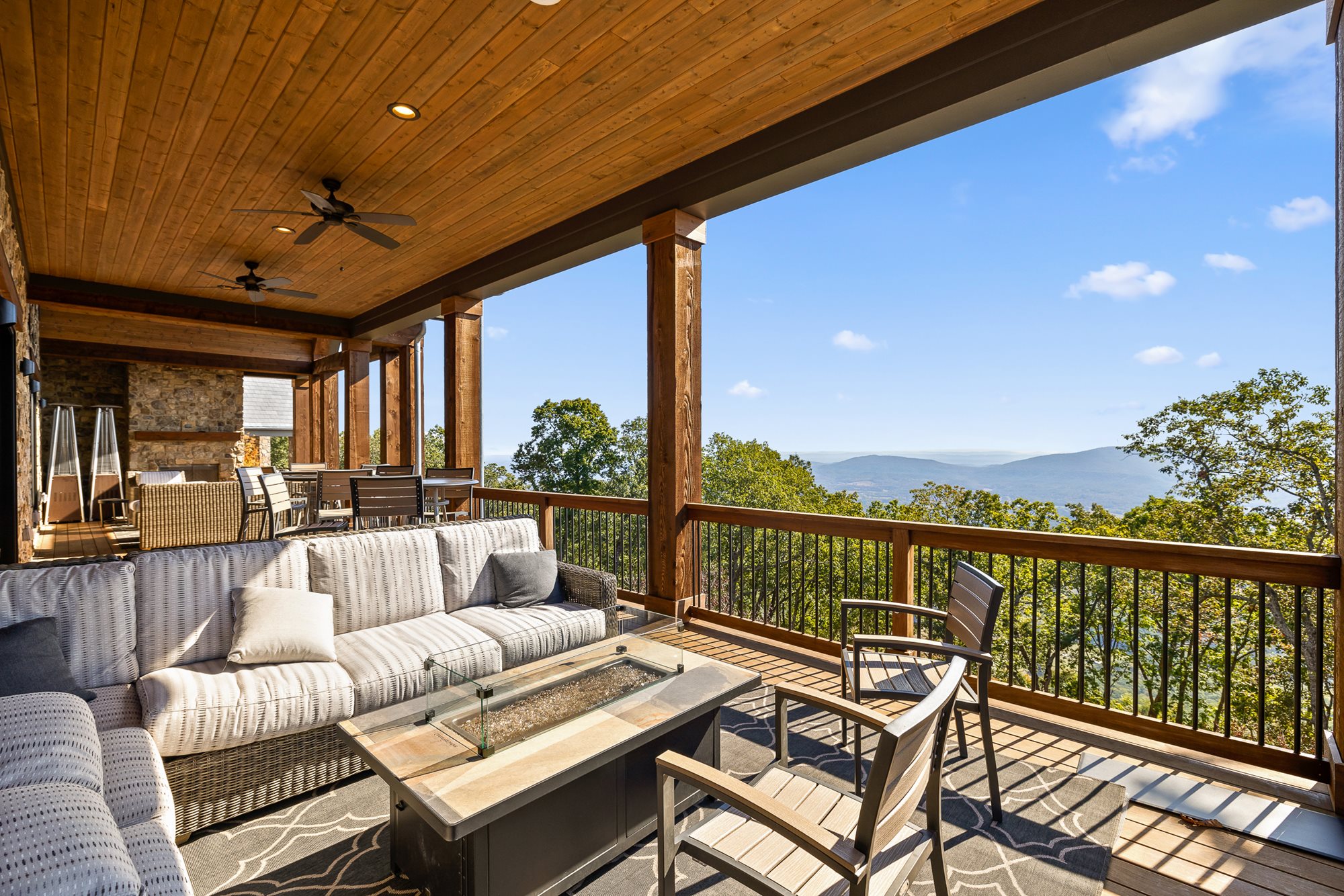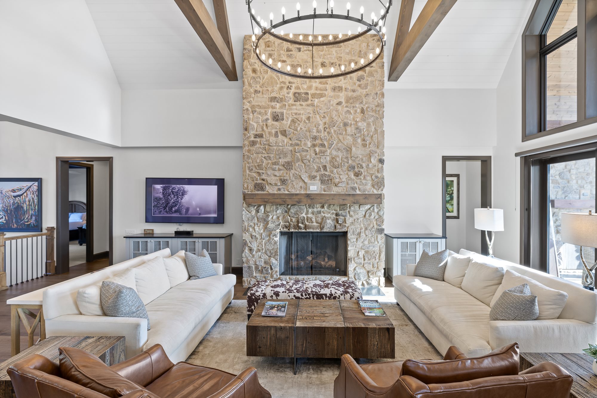 The primary bedroom is located on the main level of the home with additional bedrooms on both levels. Both floors feature comfortable seating, large TVs, and an outdoor covered patio connecting to the serene outdoor fire pit.