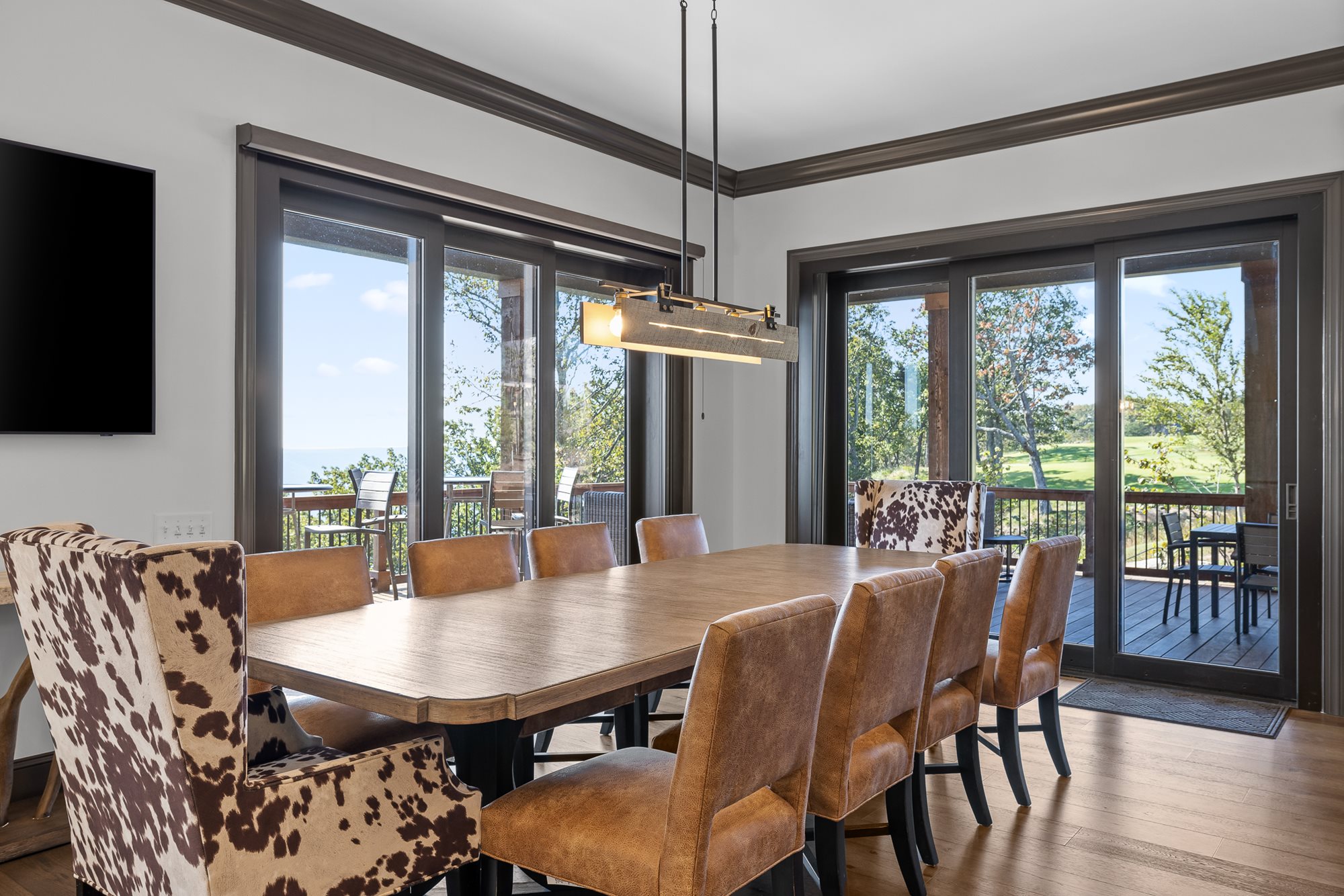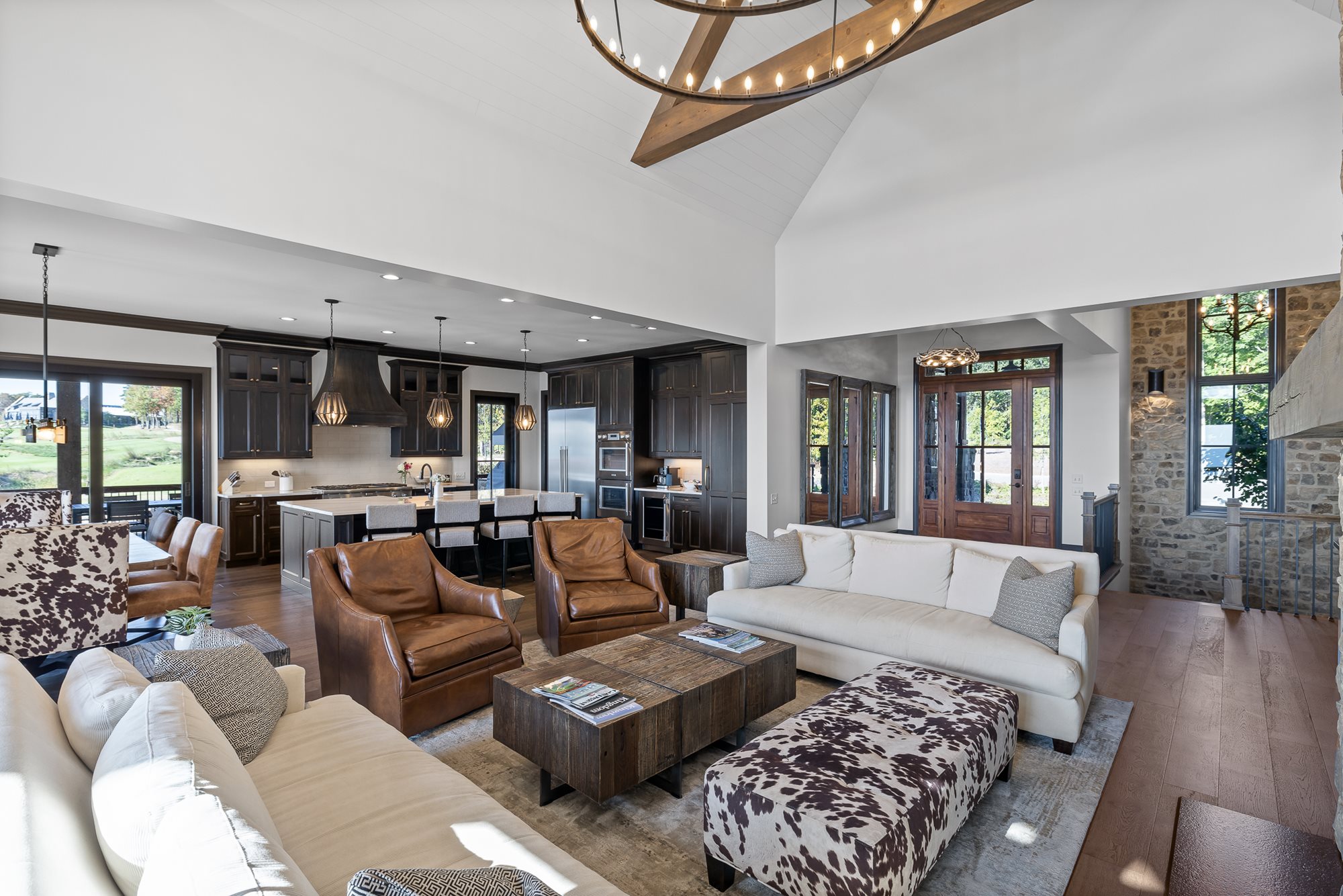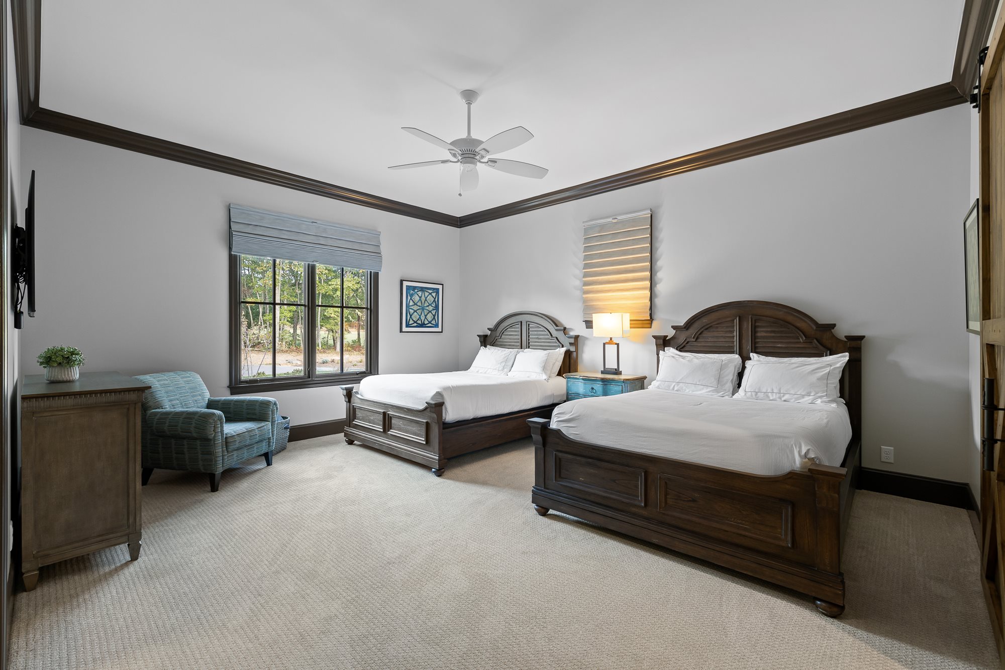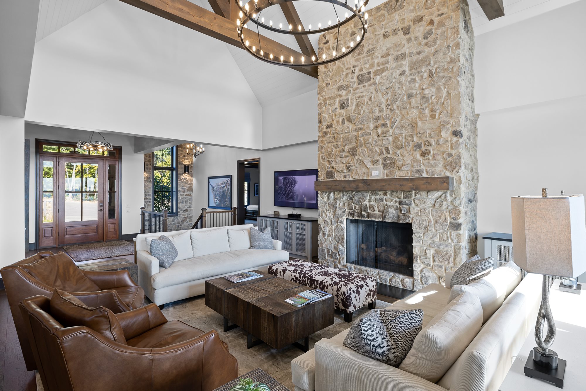 The primary bedroom is located on the main level of the home with additional bedrooms on both levels. Both floors feature comfortable seating, large TVs, and an outdoor covered patio connecting to the serene outdoor fire pit.