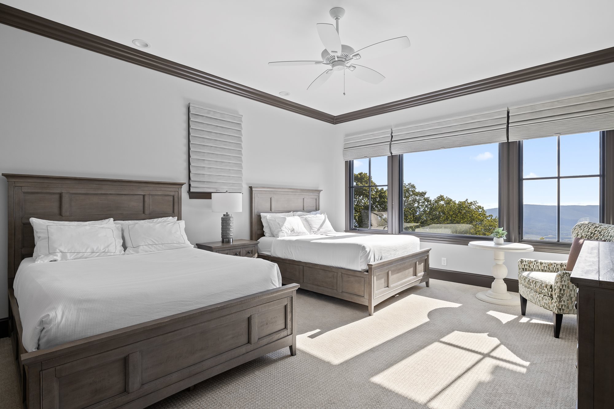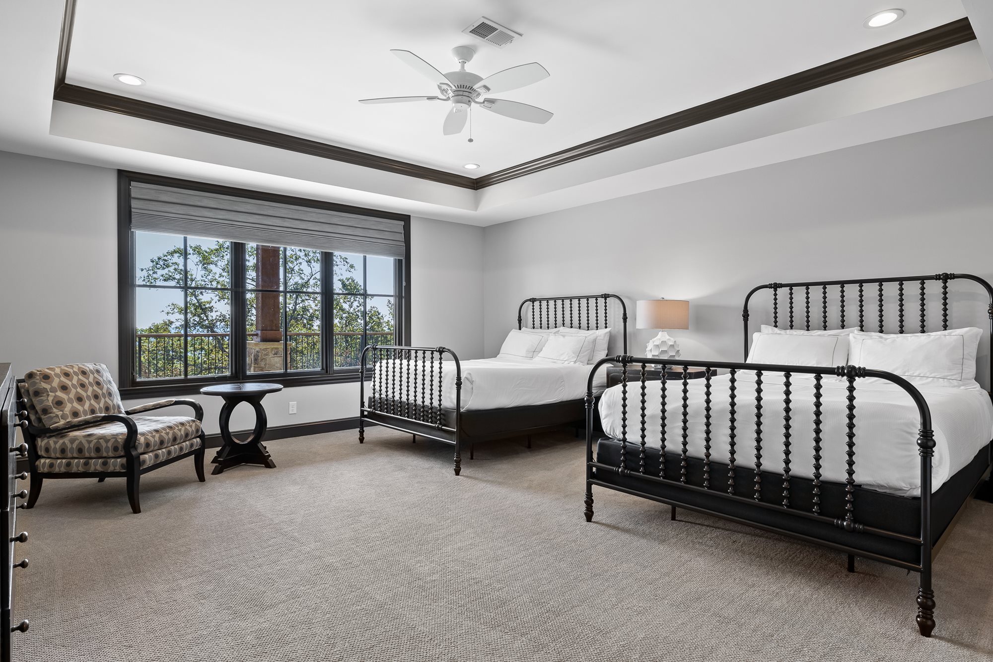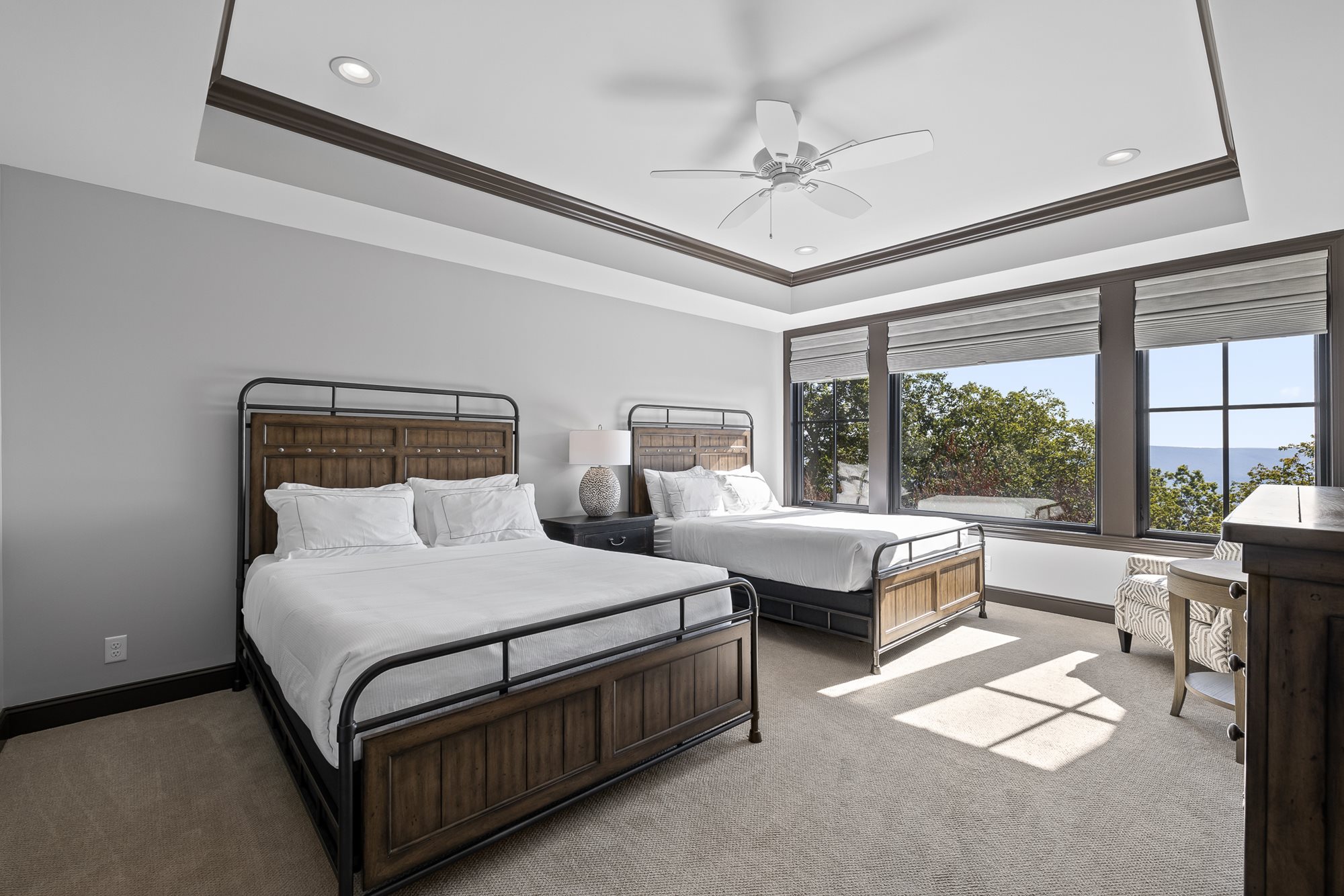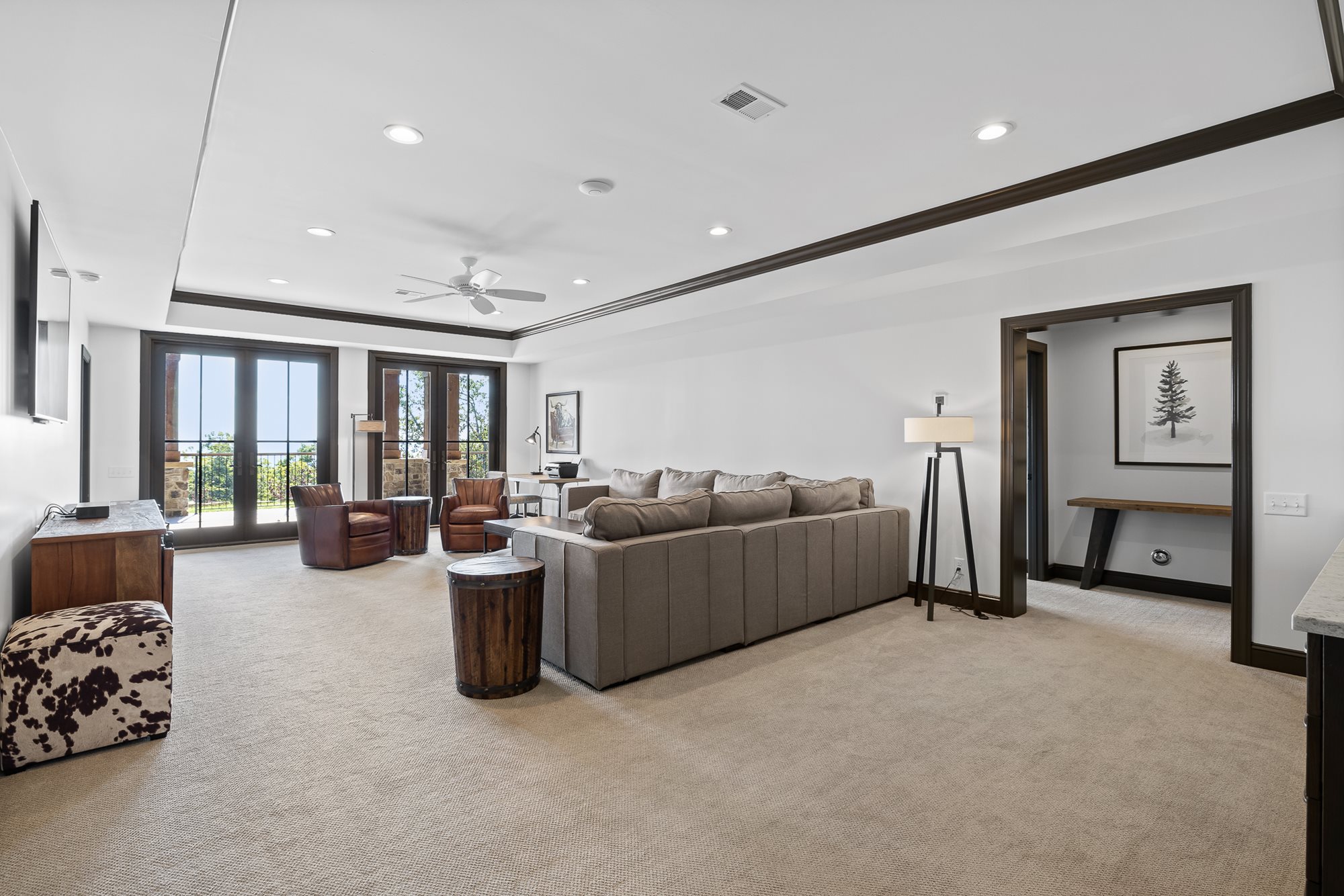 The primary bedroom is located on the main level of the home with additional bedrooms on both levels. Both floors feature comfortable seating, large TVs, and an outdoor covered patio connecting to the serene outdoor fire pit.