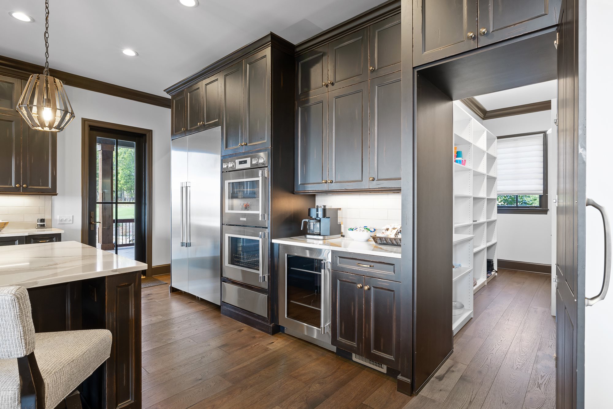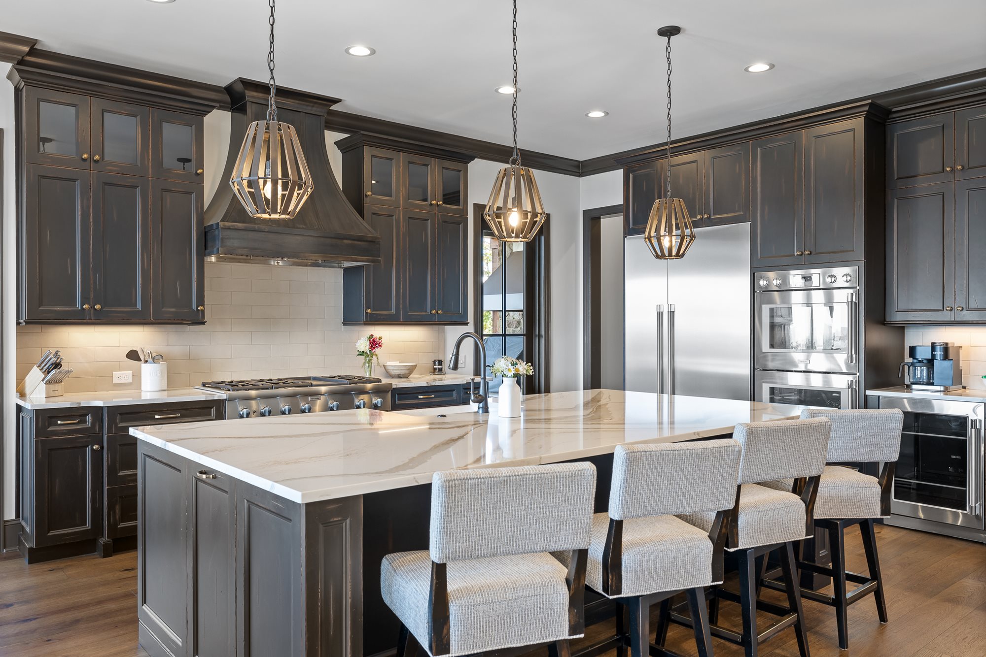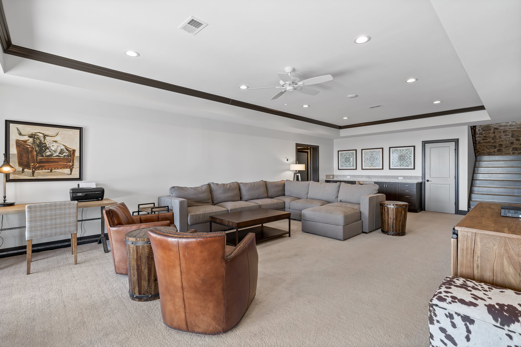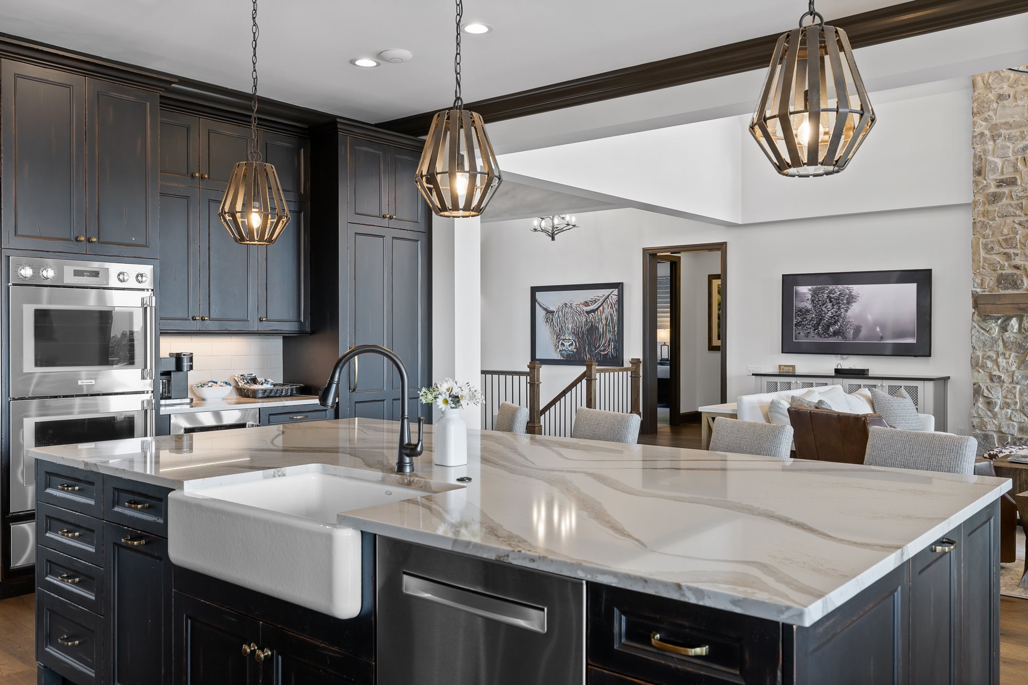 The primary bedroom is located on the main level of the home with additional bedrooms on both levels. Both floors feature comfortable seating, large TVs, and an outdoor covered patio connecting to the serene outdoor fire pit.