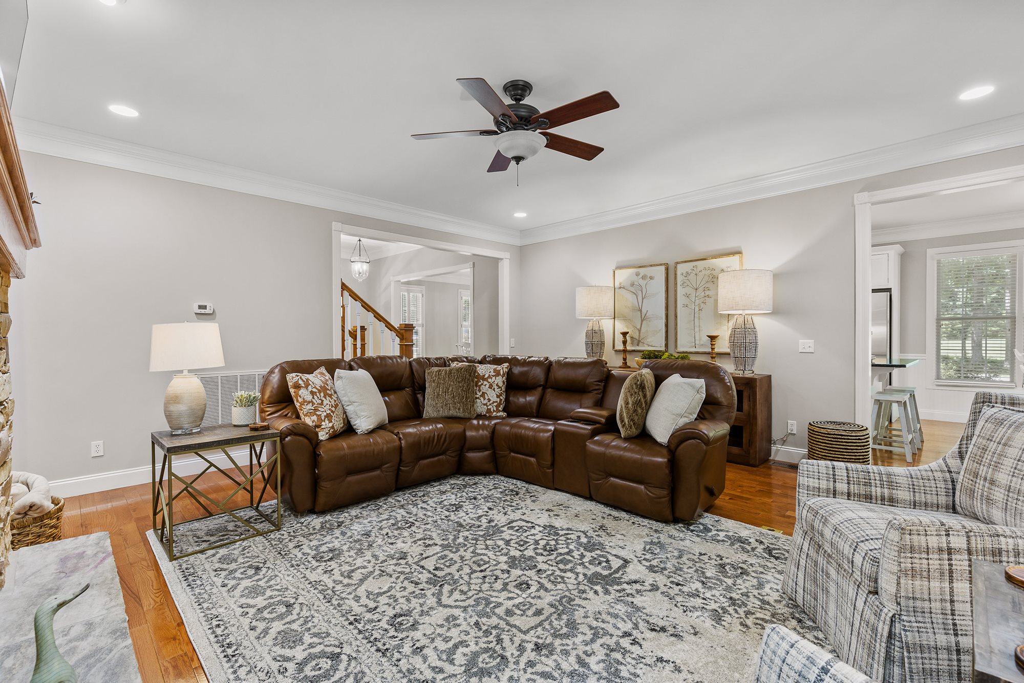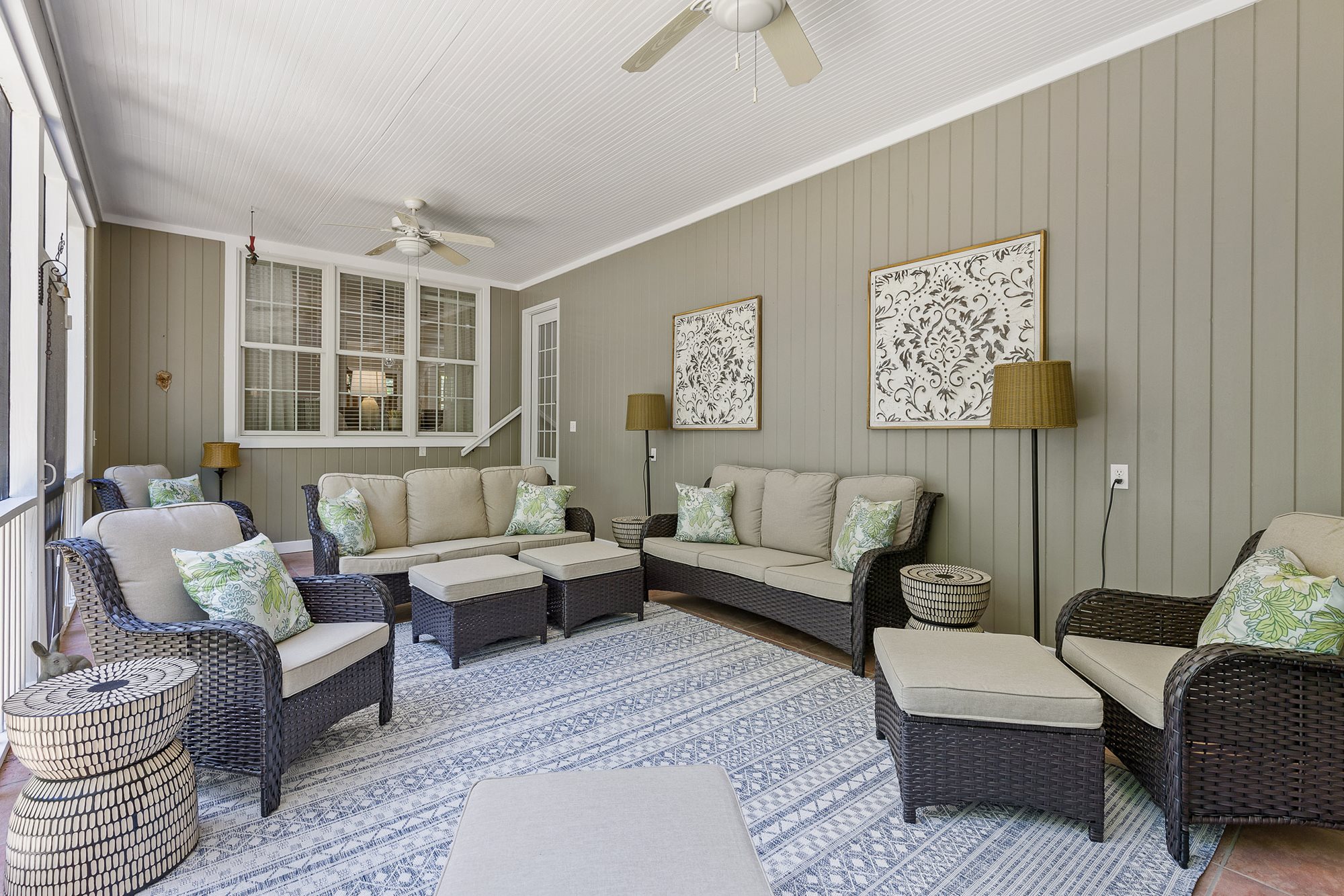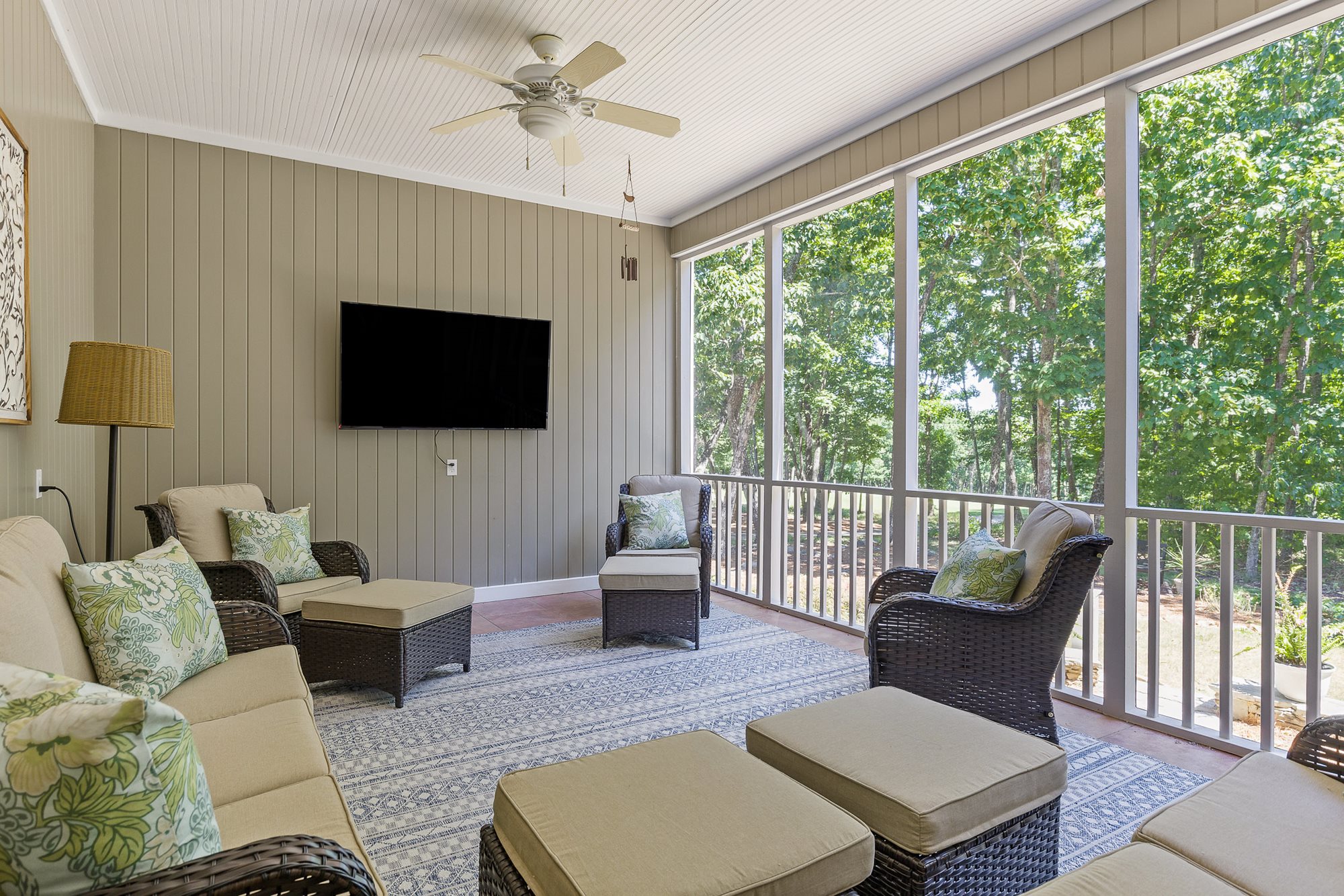 The primary bedroom is located on the ground floor, with the remaining bedrooms, including a mother-in-law suite, on the second floor. The kitchen includes state of the art appliances and opens to both formal and informal dining areas, great for entertaining guests. The living space and screened back patio are furnished with comfortable sofas and lounge chairs providing a great place to relax after a long day on the course or hiking local trails.