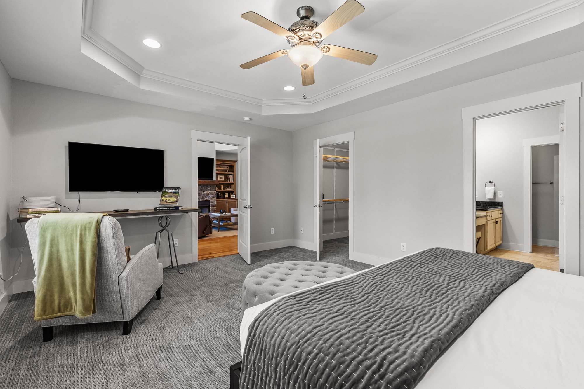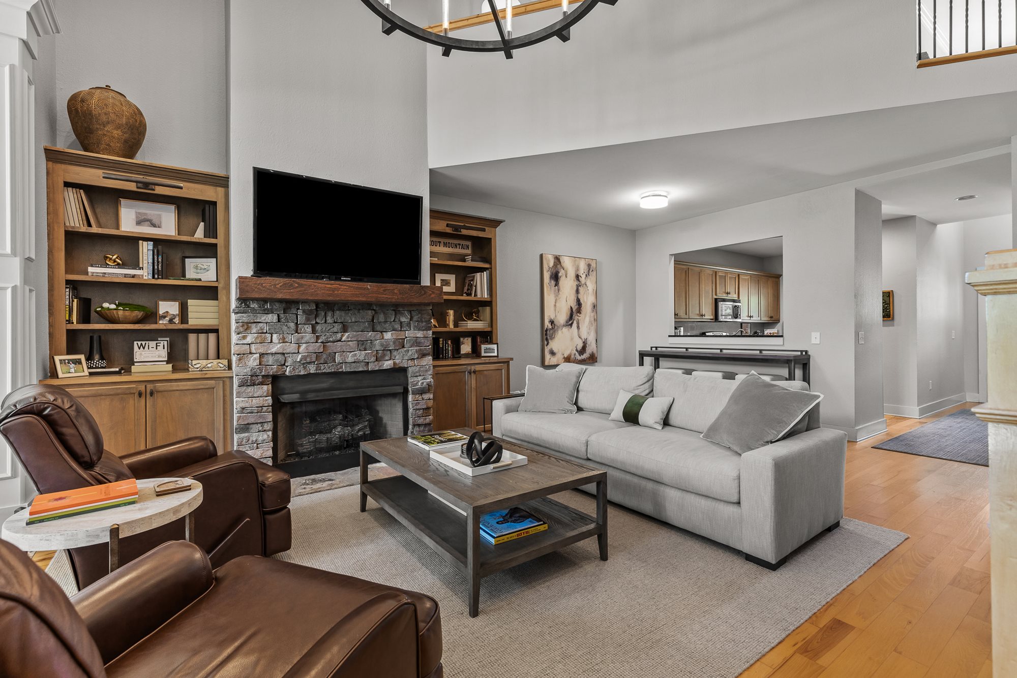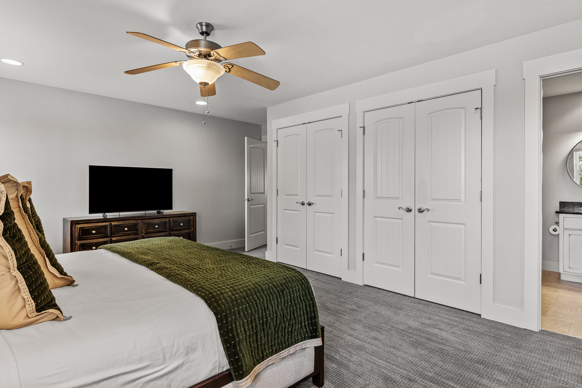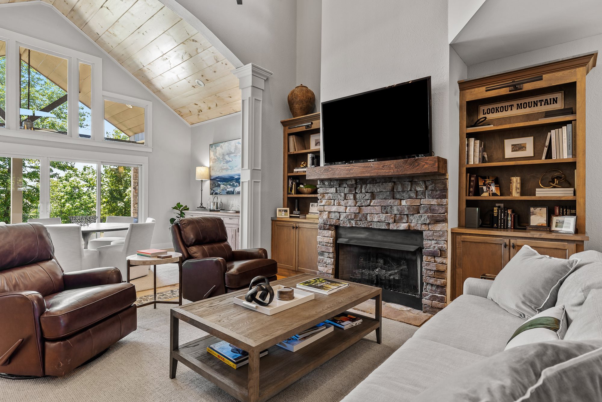 The kitchen includes state of the art appliances and extends into an open, two story living and dining room. The open floorplan lends itself to entertaining family and guests, and soft, comfortable sofas and lounge chairs provide a welcome place to relax after a long day on the course or hiking local trails.