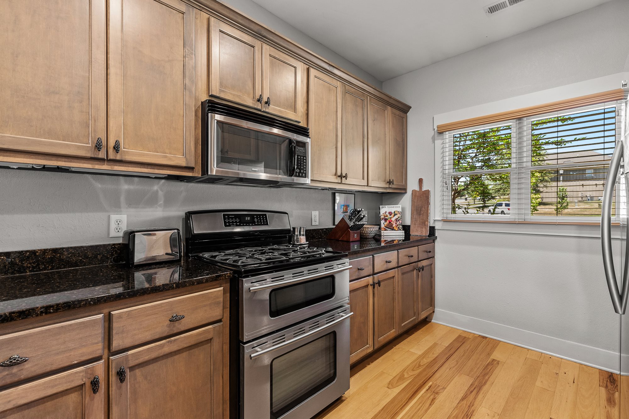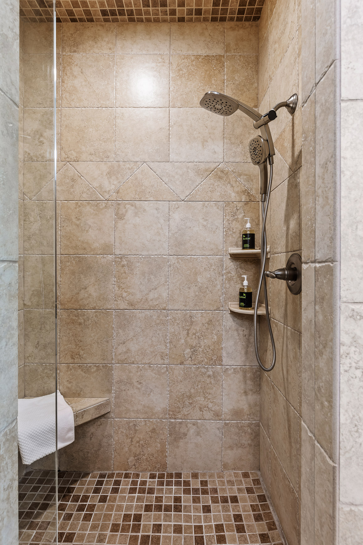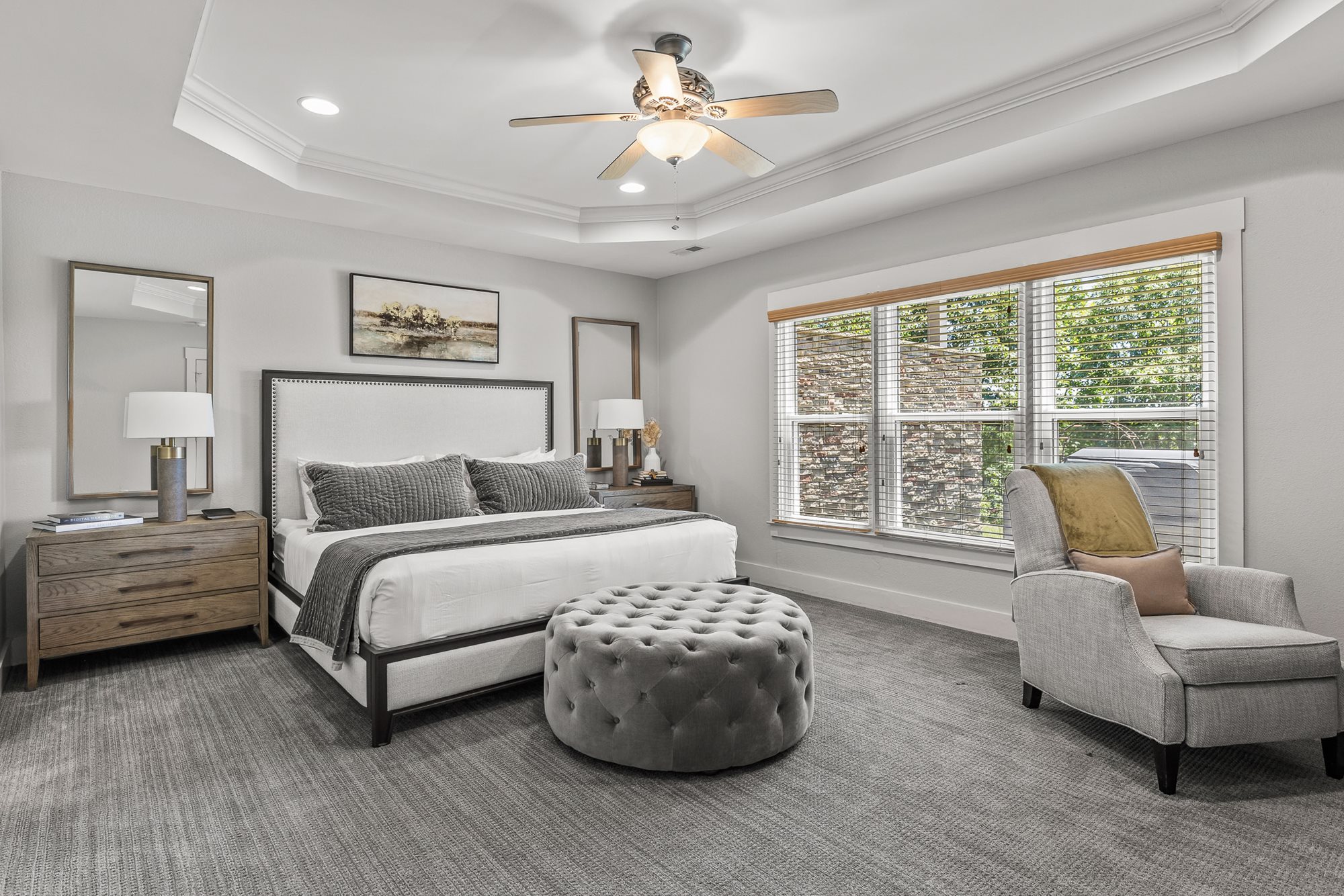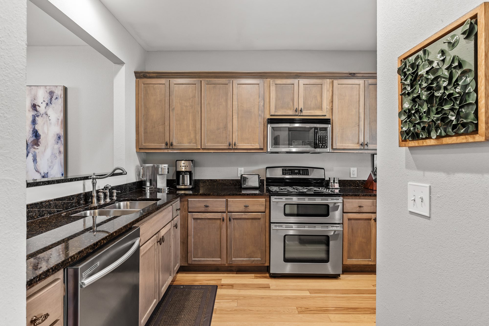The kitchen includes state of the art appliances and extends into an open, two story living and dining room. The open floorplan lends itself to entertaining family and guests, and soft, comfortable sofas and lounge chairs provide a welcome place to relax after a long day on the course or hiking local trails.