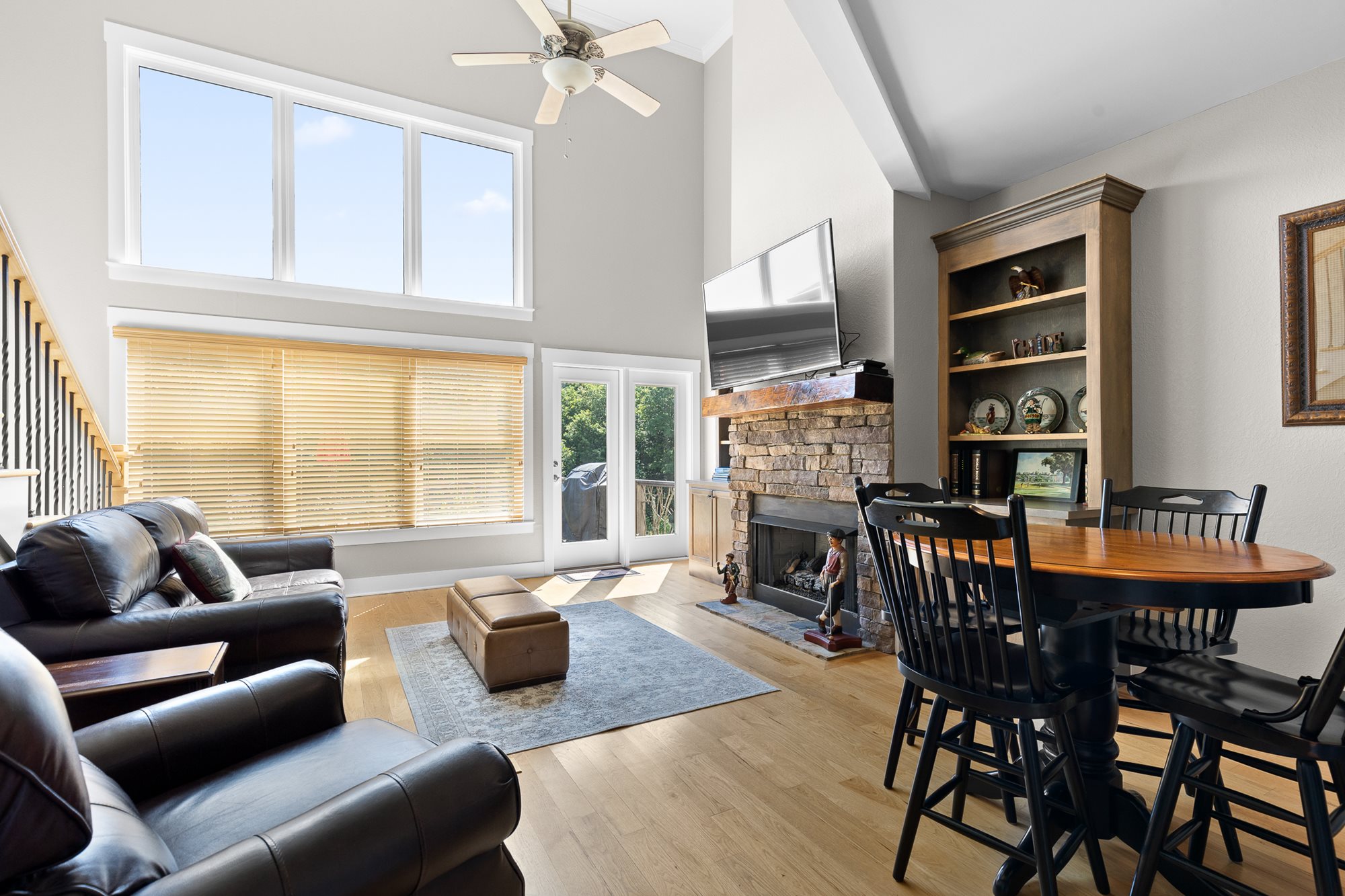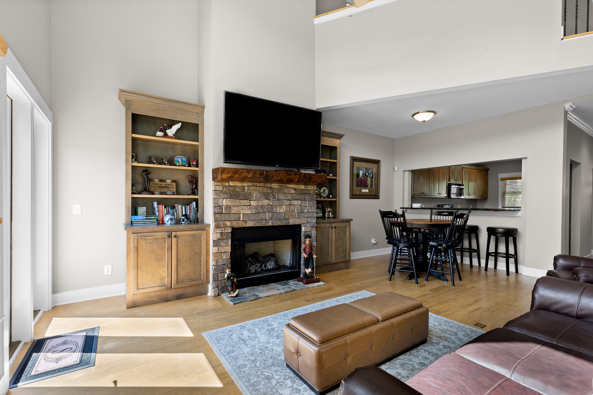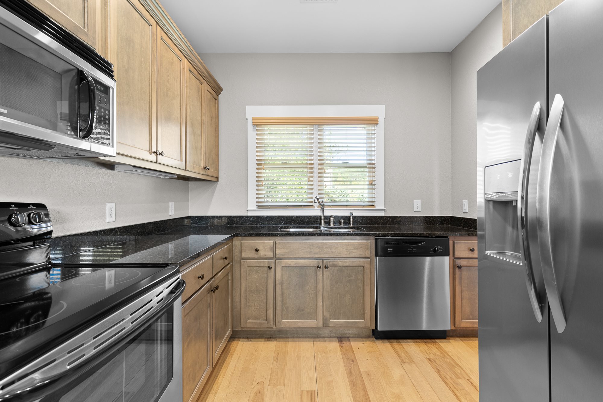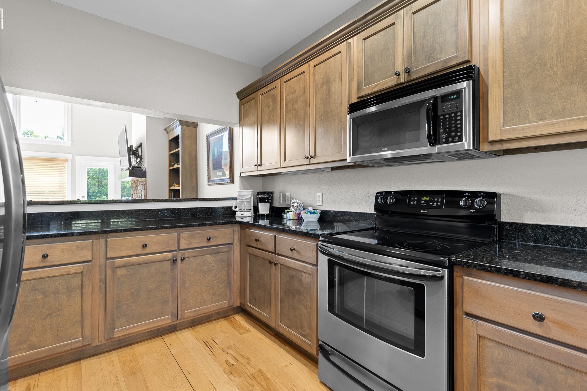The kitchen includes a full suite of appliances and extends into an open, two story living room and dining room. The open floorplan lends itself to entertaining family and guests, and soft, comfortable sofas and lounge chairs provide a welcome place to relax after a long day on the course or hiking local trails.