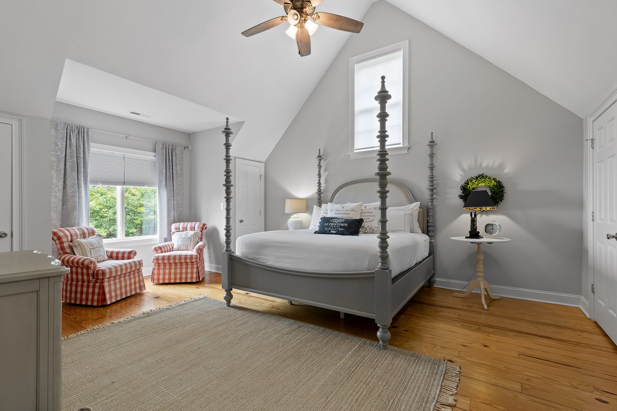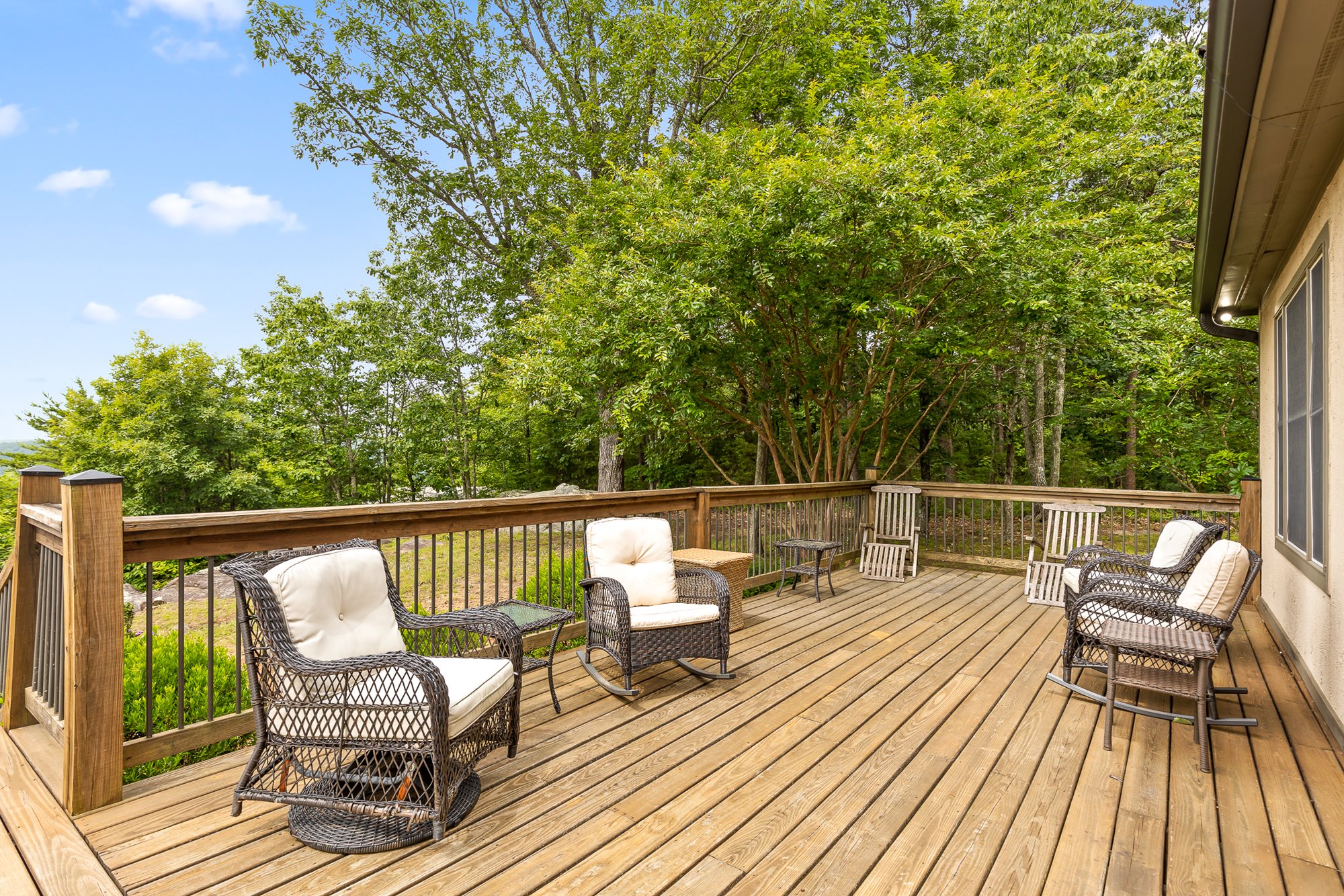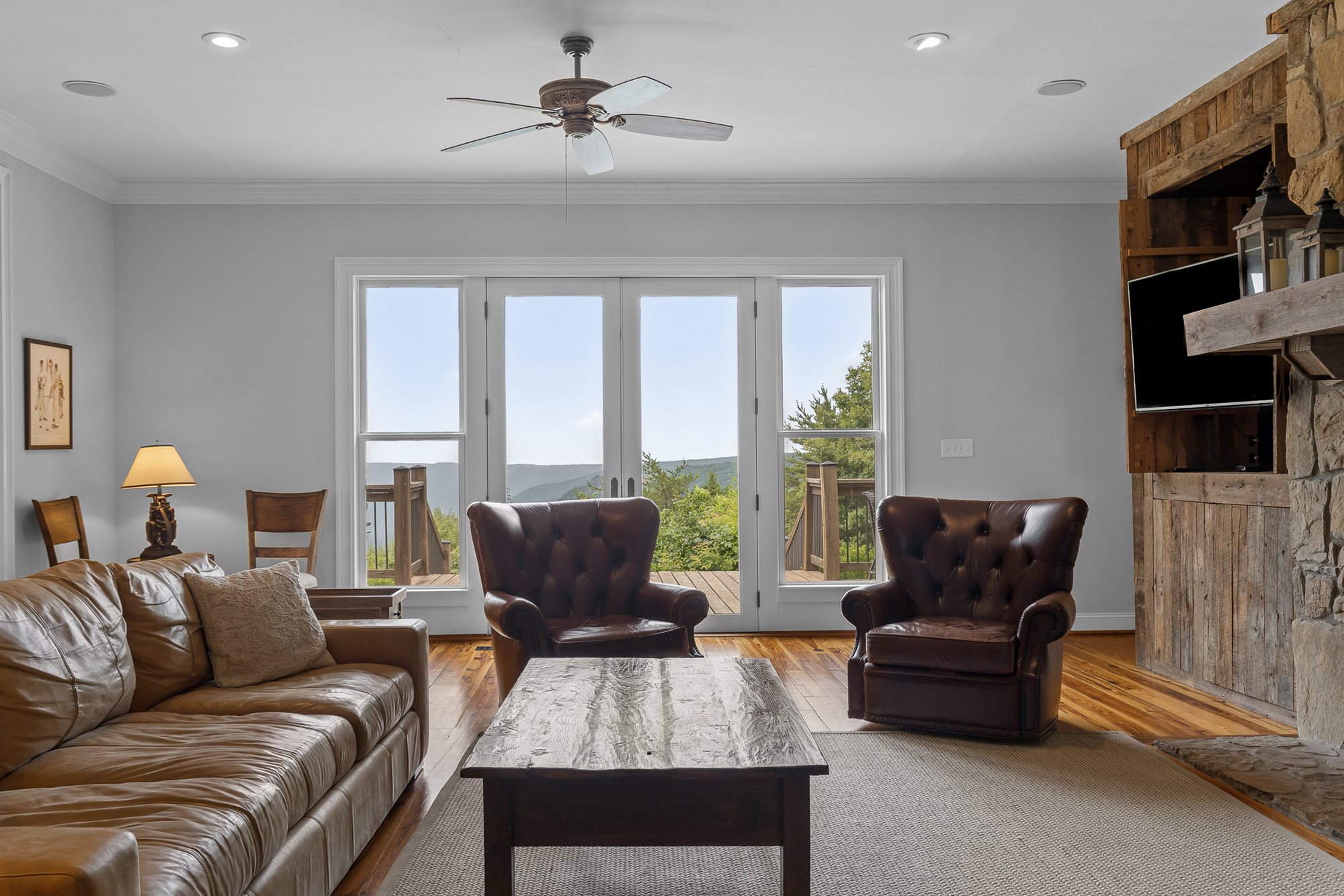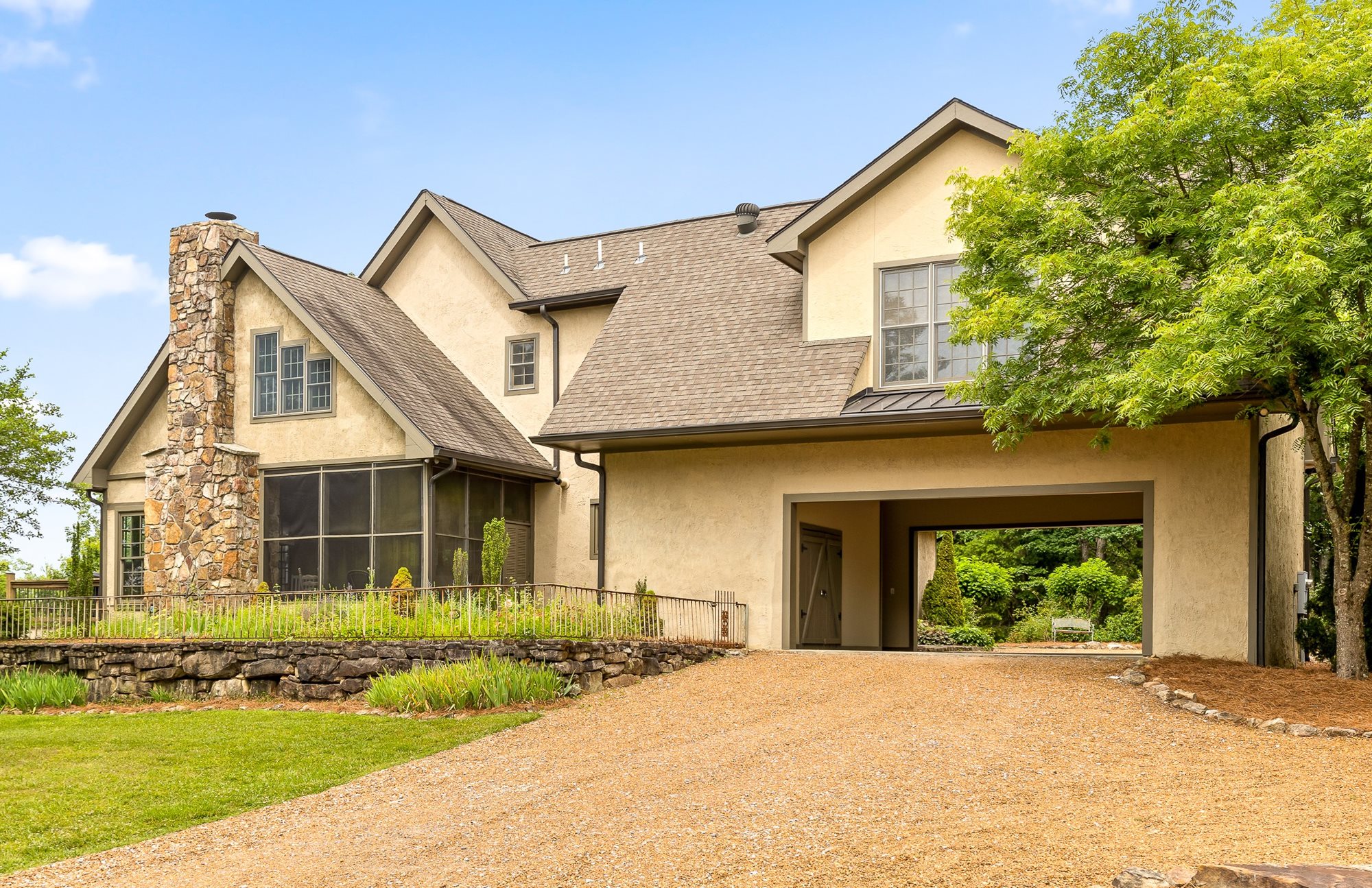 This large, French country-style home is set along the cliff-edge of Lookout Mountain overlooking McLemore's first hole and Cloudland Lodge at McLemore Resort. The two-story house features five bedrooms and five and ½ baths with the primary bedroom on the first floor. The additional four bedrooms, each with a private bath, are on the second floor. Each room is uniquely furnished and decorated with a comfortable arrangement of king and queen beds, and there are daybeds in two of the bedrooms, offering a total sleeping capacity of up to 14 guests.