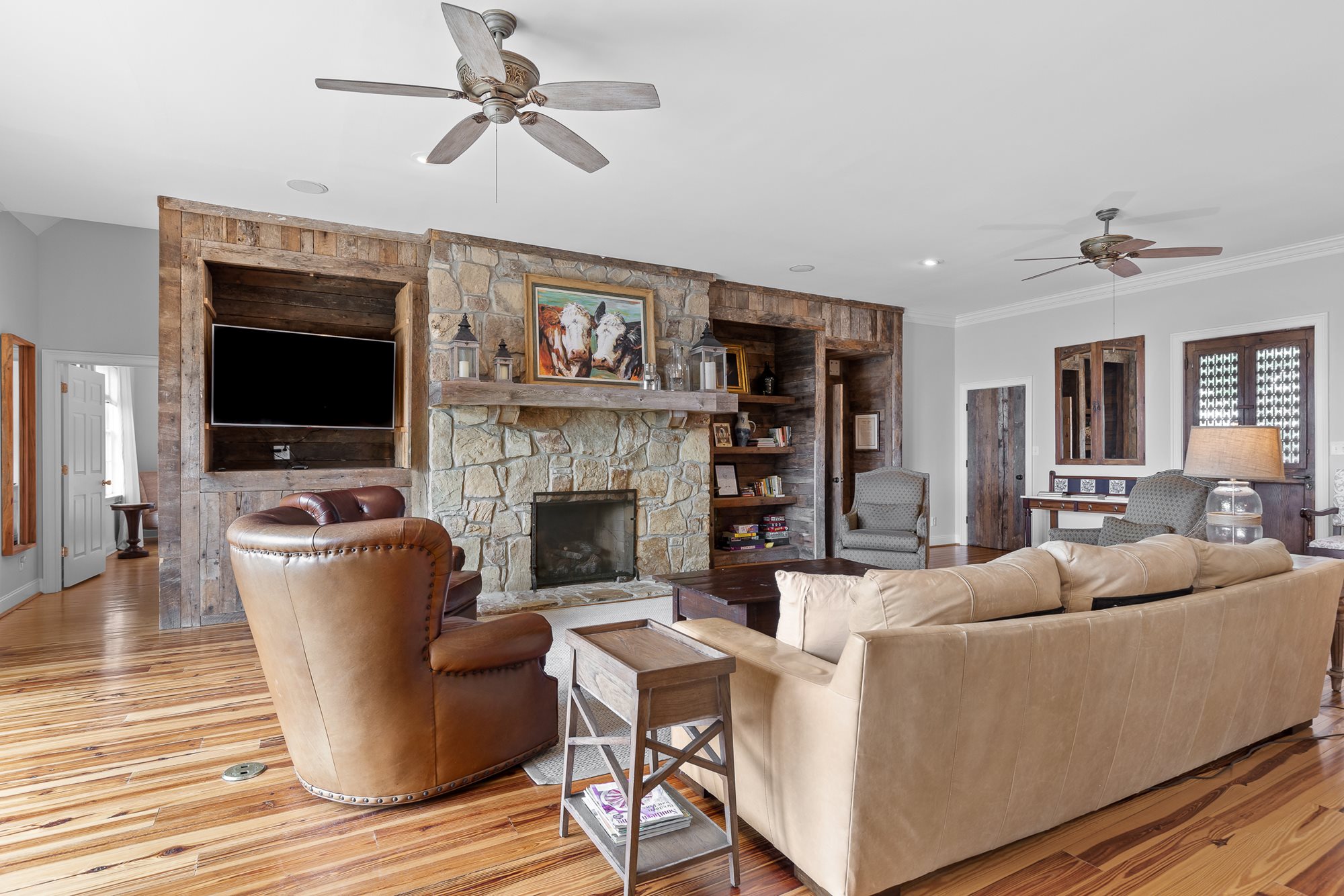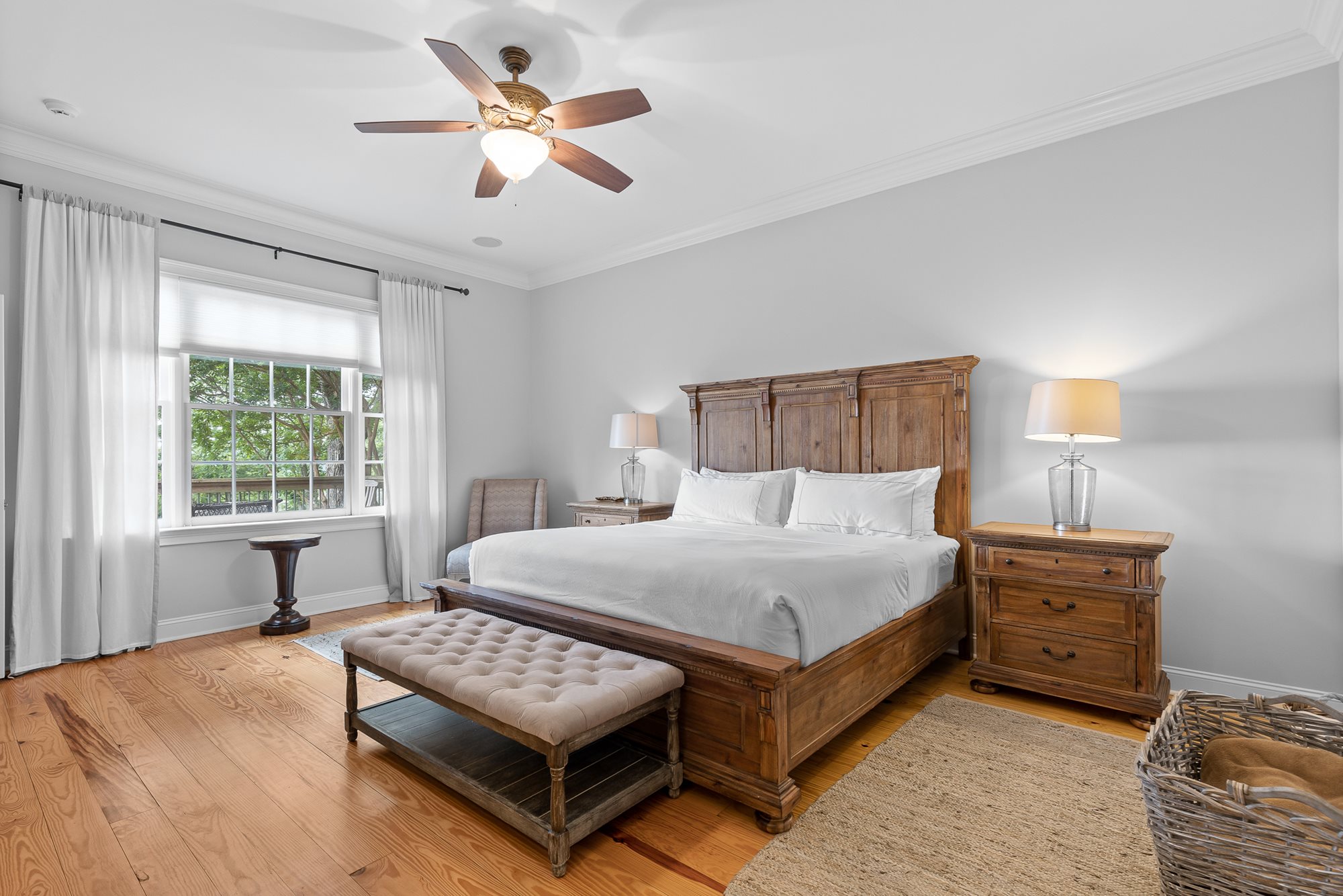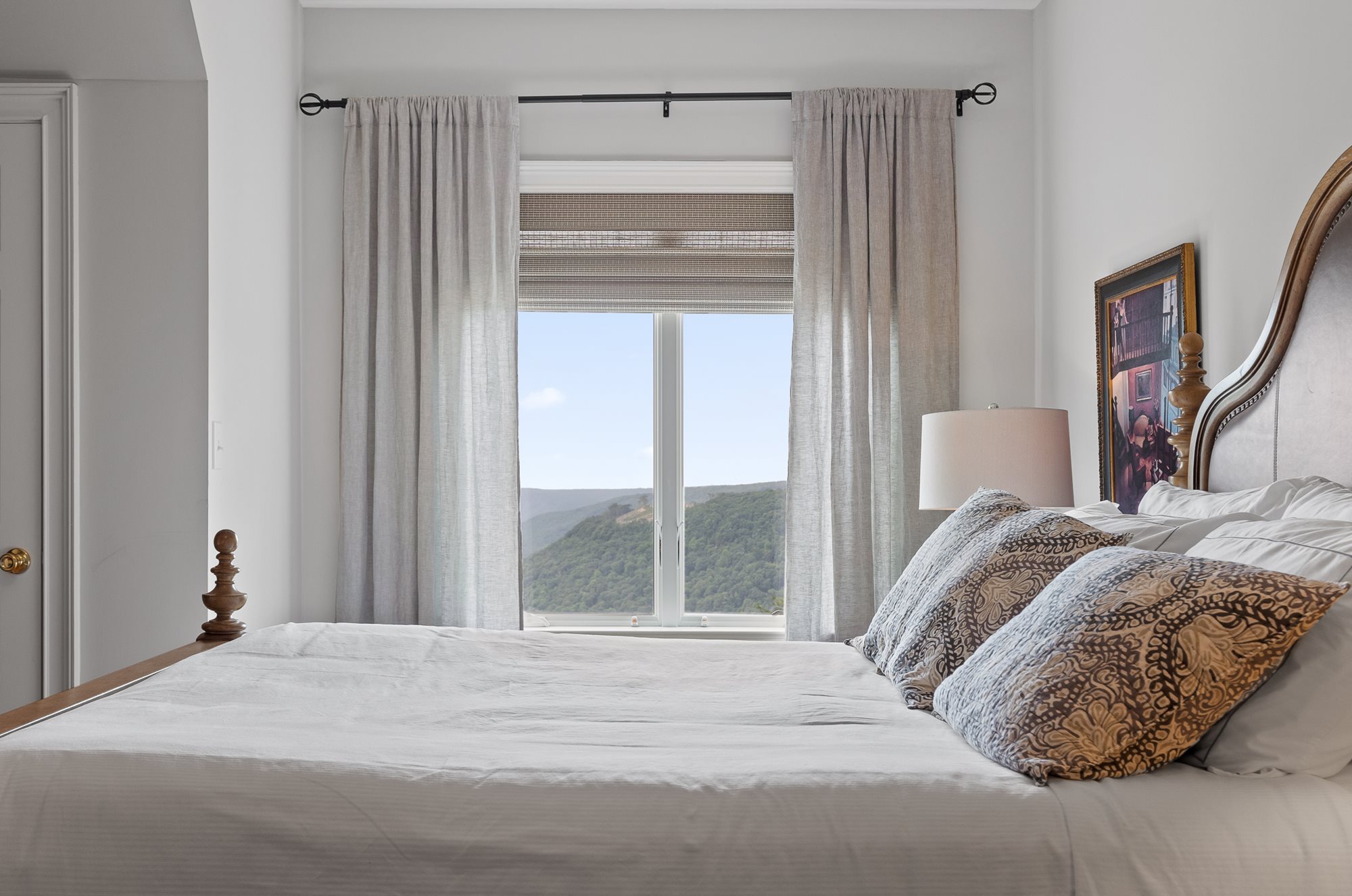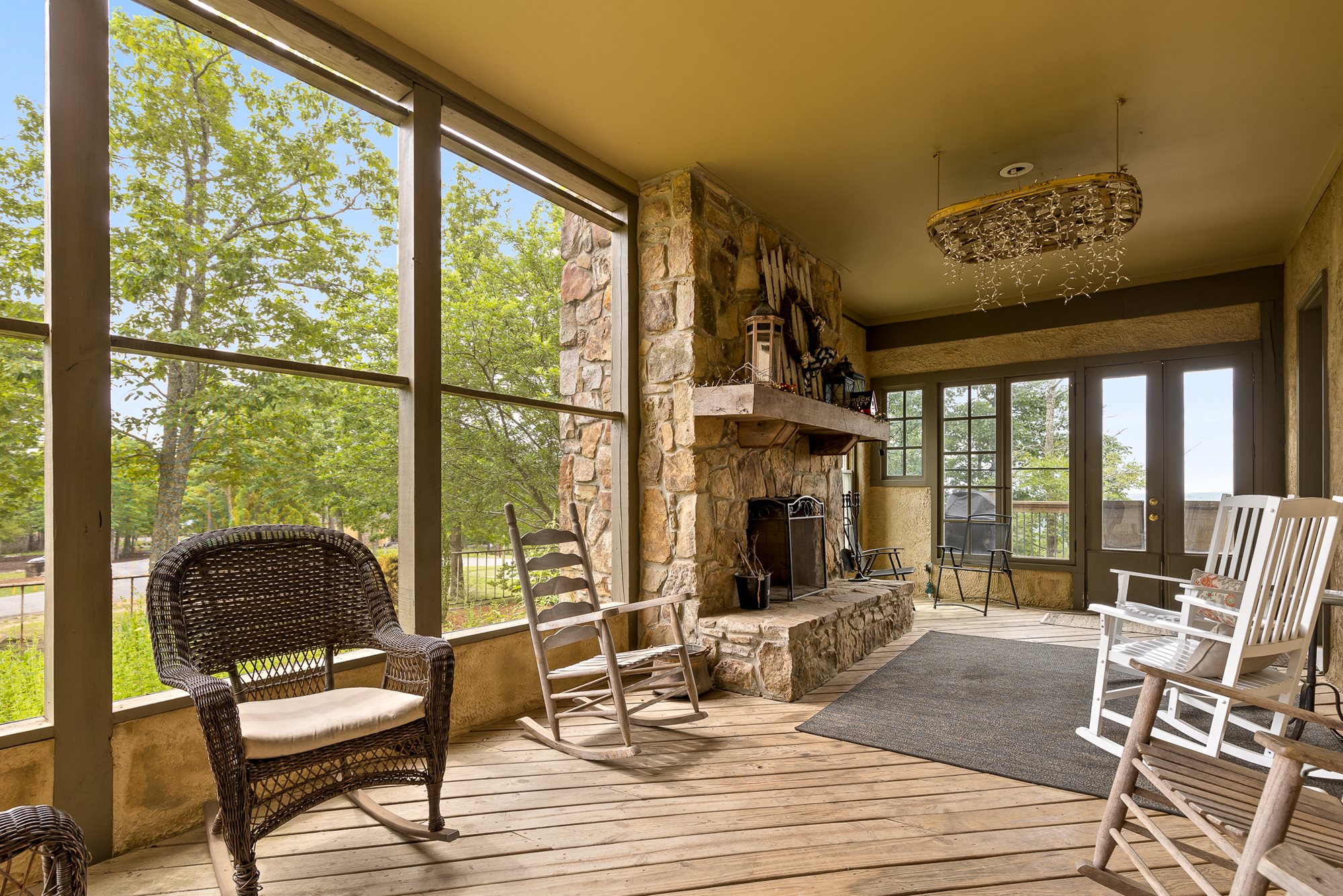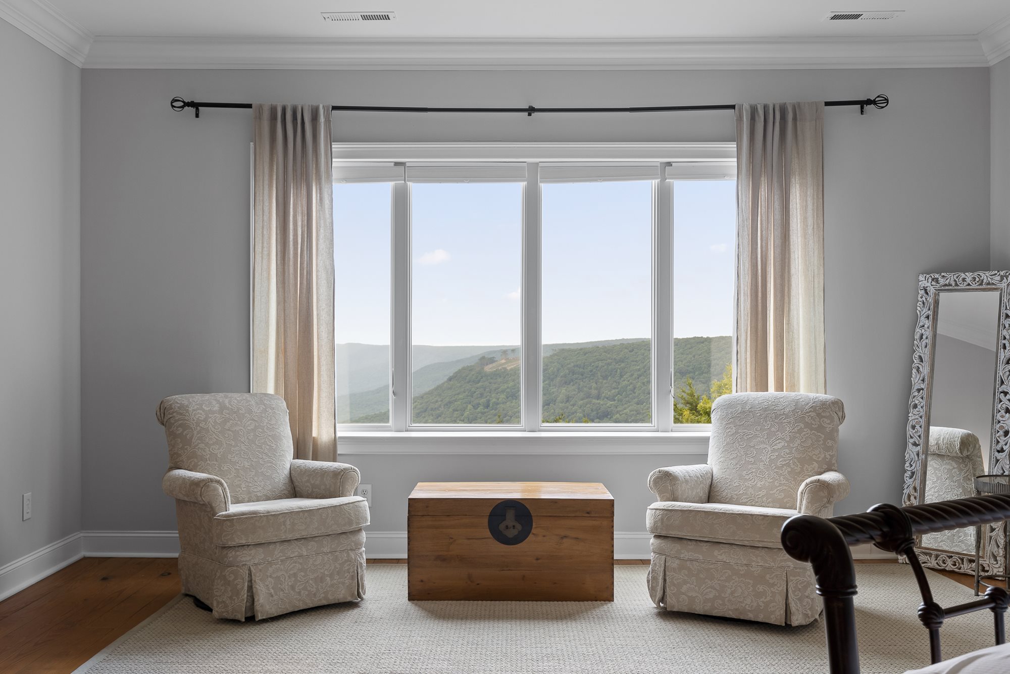 This large, French country-style home is set along the cliff-edge of Lookout Mountain overlooking McLemore's first hole and Cloudland Lodge at McLemore Resort. The two-story house features five bedrooms and five and ½ baths with the primary bedroom on the first floor. The additional four bedrooms, each with a private bath, are on the second floor. Each room is uniquely furnished and decorated with a comfortable arrangement of king and queen beds, and there are daybeds in two of the bedrooms, offering a total sleeping capacity of up to 14 guests.